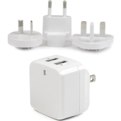 Charge your tablet and phone simultaneously almost anywhere around the world - Dual Port USB Charger - White 2 Port USB Charger - 2 Port USB AC Charger for Apple and Android Devices - High Power (17 Watt / 3.4 Amp) - 1x 2.4A USB 2.0 port (for iPad &Tablets) - 1x 1A USB 2.0 port (for iPhone & smartphones) - International Travel Charger 110V/220V