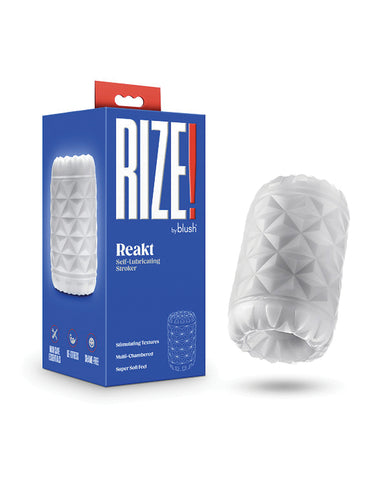 The Rize! Reakt is loaded with fun! This versatile pocket stroker is a man-cave essential. With self-lubricating technology, all you need is to add a little bit of water or saliva to your stroker to make it slippery and smooth, then slide right in! Reakt is crafted with premium X5® Plus, which feels incredibly silky to the touch, providing luxury with every movement. Featuring 3 deeply erotic pleasure chambers including 2 tug chambers and 1 tickle chamber, you'll experience the perfect combination of massaging sensations. Reakt naturally warms to your body temperature, adjusting to your touch to heat up your desires for a highly realistic feel. Simply squeeze to apply desired pressure to intensify your pleasure while stroking. Get ready to destress and release. This pocket stroker is small, discreet and easy to clean. Make your solo play the best time of day -? Let Reakt be the reason you Rize!
