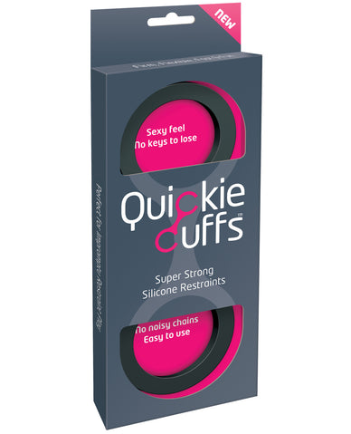 Be ready for anything with the completely transportable, sensuous, easy to use Quickie Cuffs. Quiet - no noisy chains. Universal - Flexible silicone to fit anyone's wrists. Instant - no fiddly keys or ill-fitting cuffs. Comfortable Control - soft but strong and secure silicone. Innovative - first flexible cuffs on the market. Color - black. Easy - Anytime, Anyplace.