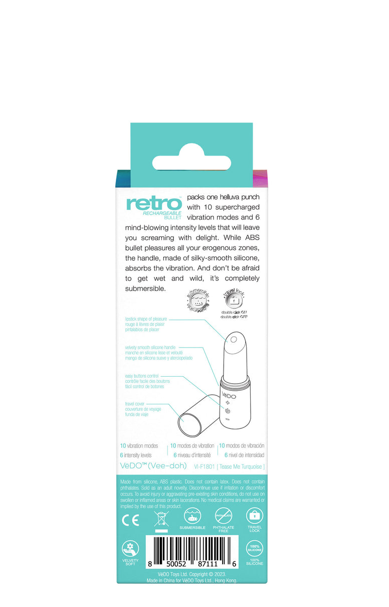 Retro Rechargeable Bullet packs one helluva punch with 10 supercharged vibration modes and 6 mind blowing intensity levels that will leave you screaming with delight. While the bullet point pleasures all your erogenous zones, the silky smooth silicone handle gives you maximum handling control. And don't be afraid to get wet and wild, it's completely submersible. <br><br> • Lipstick shape of pleasure <br> • Velvety smooth silicone handle <br> • Control the intensity <br> • Travel cover <br> • 10 vibration modes <br> • 6 intensity levels <br> • Submersible <br> • Phthalate free <br> • Travel lock <br> • 100% silicone <br><br> MEASUREMENT: <br> • Length: 4.5" (11.43 cm) <br> • Width: 1" (2.54 cm)