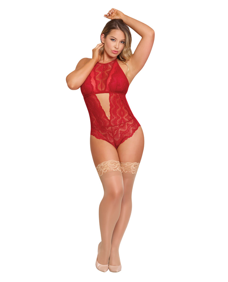 From the Exposed by Magic Silk collection, this style includes: a teddy featuring a high neck design with elastic tie-back straps at the neck and hook & eye closures in the back, cut out accents in the front and back, soft lace details and a snap crotch. 90% Nylon, 10% Spandex. Hand Wash Cold. No Bleach. Dry Flat. S/M 4-10.